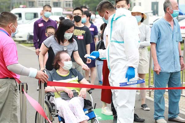 在工作人员的引导下,居民秩序排队, 有序进入检测点。