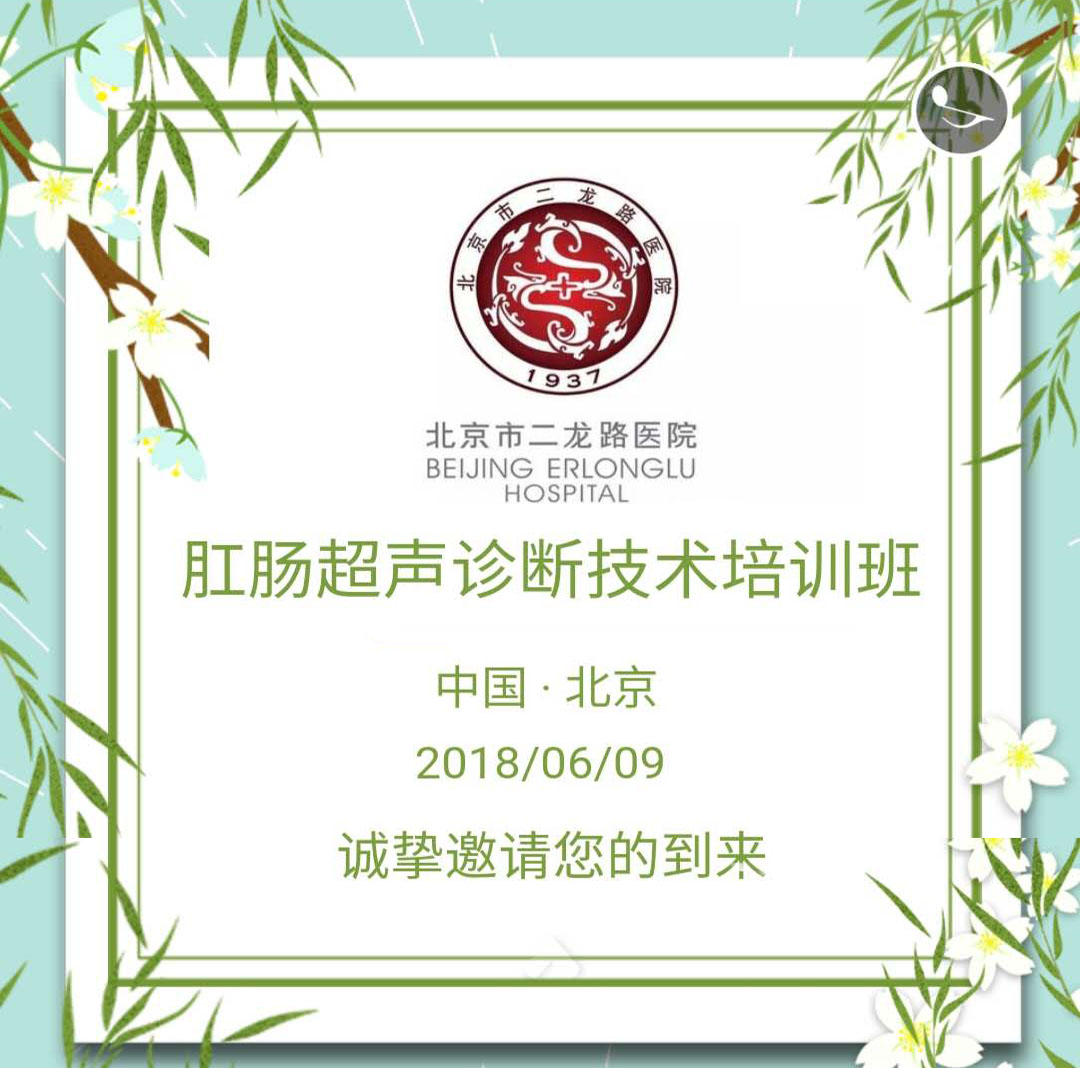 尊敬的各位专家、学者、同仁:为提高肛肠超声诊断技术的诊断水平,由北京市肛肠医院(北京市二龙路医院)、北京市肛肠疾病研究院主办,超声科承办的“肛肠超声诊断技术培训班”,将于2018年6月9…