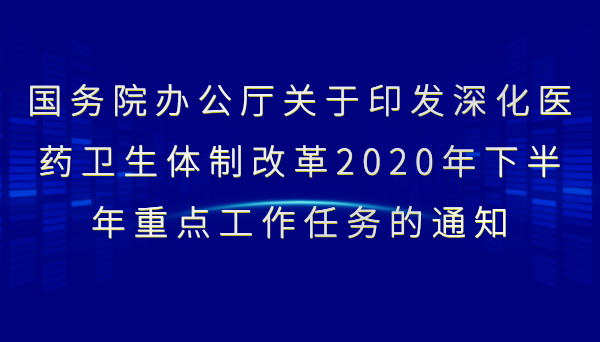 国办发〔2020〕25号各省、自治区、直辖市人民政府,国务院各部委、各直属机构: 《深化医药卫生体制改革2020年下半年重点工作任务》已经国务院同意,现印发给你们,请结合实际,认真组织实施。 …