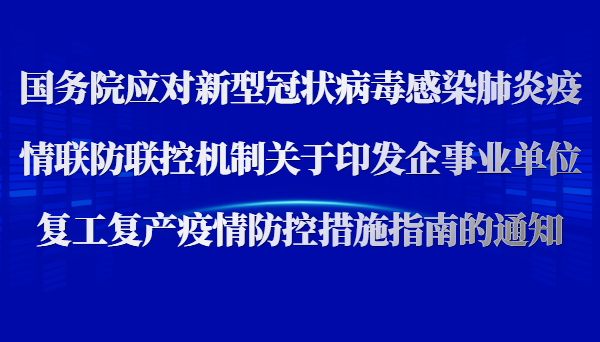 国发明电〔2020〕4号各省、自治区、直辖市人民政府,国务院各部委、各直属机构: 《企事业单位复工复产疫情防控措施指南》已经中央应对新型冠状病毒感染肺炎疫情工作领导小组同意,现印发给你们…