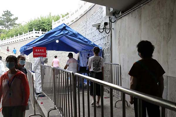 在工作人员的引导下,居民秩序排队, 有序进入检测点。