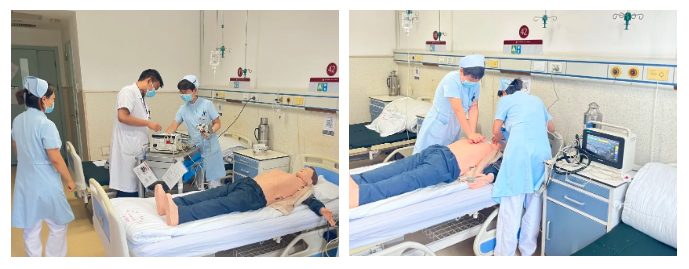 本次演练设定的是一名突发室上性心动过速,简单和药物处理无效进而进展至室颤的患者,全面考察外科病区医护团队对室上性心动过速这一发展具有多可能性的常见心律失常的处理和应对。随着模拟情景的启动,病区医护团队马上进入应急状态。护士立即进行病情评估,紧急呼叫医生,医生迅速到场,快速诊断和实施心电监护、吸氧并建立静脉通道,采取物理疗法与药物干预,同步请院内ICU急会诊,根据情况及时调整策略,实施电复律并在情况进一步恶化时实施心肺复苏以及后续高级生命支持,行动步骤清晰,紧张而有条不紊,最终使“患者”转危为安。