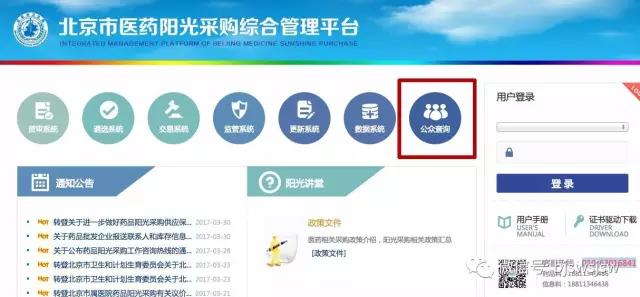 1. 进入北京市医药阳光采购综合管理平台,点击“公众查询”,即可进入药品查询页面。