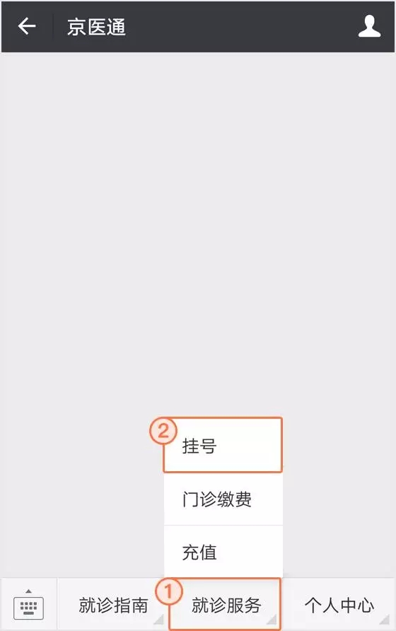 进入京医通微信公众号会话页面,点击底部菜单“就诊服务”按钮,选择“挂号”。