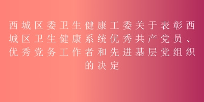 近年来,西城区卫生健康系统各级党组织和广大党员在区委卫生健康工委的正确领导下,坚持以习近平新时代中国特色社会主义思想为指导,深入贯彻落实党的十九大和十九届二中、三中、四中、五中全会…